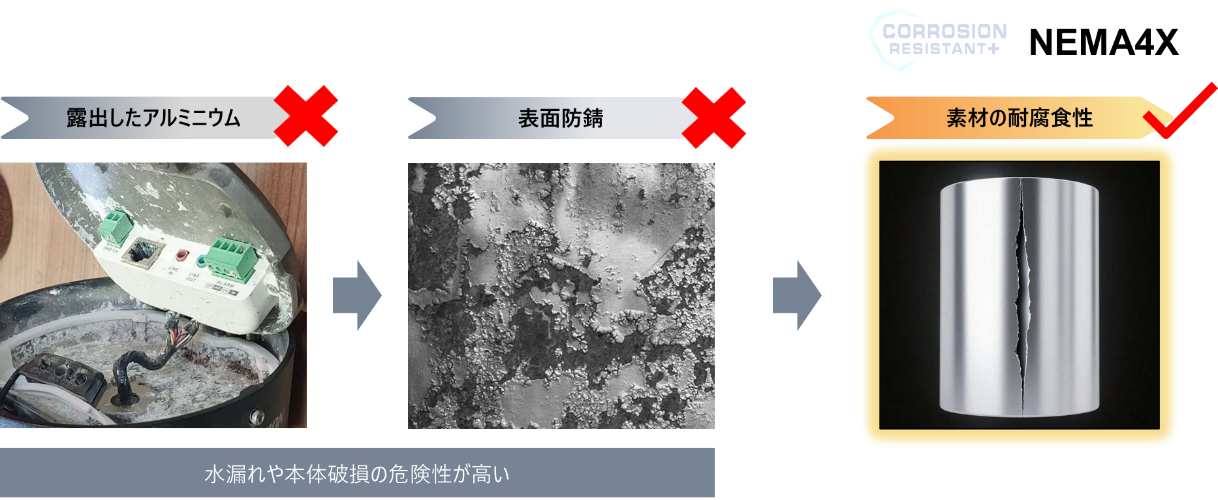 • NEMA 4X 耐食性能:耐食素材を採用。表面が傷ついても内部の耐食性が維持されるため、沿岸部などの厳しい環境下でも安心して使用できます。