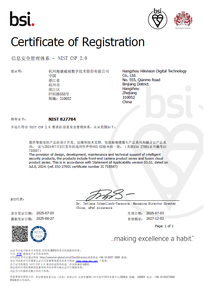HIKVISIONが、NIST CSFサイバーセキュリティフレームワーク2.0バージョンの認証を取得した。世界的権威のある基準団体・英国規格協会(BSI)による複数回の審査を経て、当社は中国国内で初めて認証を獲得した企業となり、サイバーセキュリティガバナンス、リスク管理、コンプライアンス基準への適合性が国際的な先進水準に達したことが認められた。