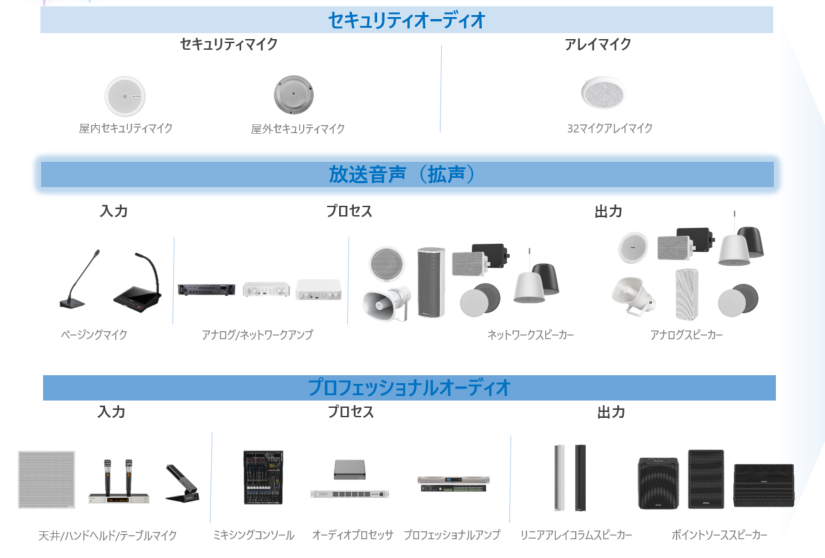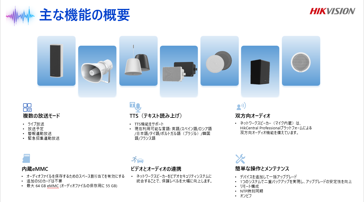 Hikvisionのオーディオ製品は、公共放送(PA)システムを核に、ネットワーク型とアナログ型の2つのラインで構成されています。主な特徴は以下の通りです。