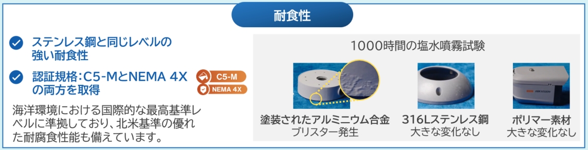 そのため、Hikvisionは新世代のポリマー素材で腐食問題を解決するという新たなソリューションを提出しました。ポリマー素材を採用することにより、下記の機能を実現しました。