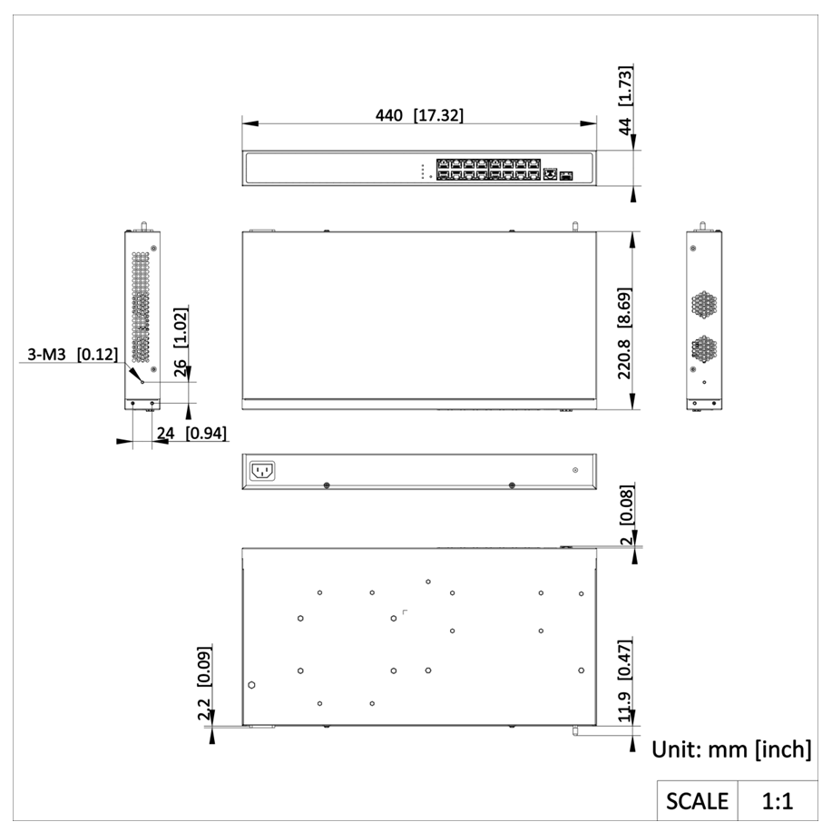 | 寸法(幅× 高さ× 奥行) | 440.0 mm× 220.8 mm× 44.0 mm (17.32”× 8.69”× 1.73”) |