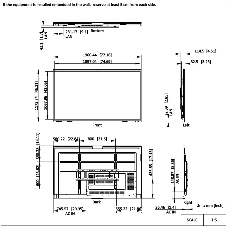 VESA 800 mm × 600 mm (4 × M8-25 mm)